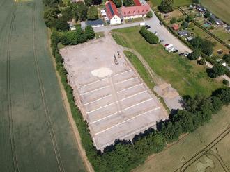 Auch auf dem Sportplatz gehen die Arbeiten gut voran. Wenn Sie diese Zeilen lesen, ist die letzte Schicht auf dem Platz vermutlich bereits aufgetragen worden. Es mussten etliche Tonnen Material angefahren werden.