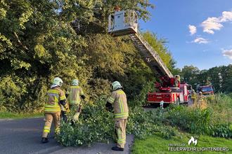 Vor Ort bestätigte sich die Lage: Ein größerer Ast lag bereits auf der Stromleitung und drohte auf die Fahrbahn zu stürzen. Umgehend wurden der zuständige Energieversorger sowie eine Drehleiter zur Einsatzstelle nachgefordert. Nach der Abschaltung der betroffenen Stromleitung konnte der Ast mittels Drehleiter sicher entfernt werden. Im Anschluss wurde die Fahrbahn gereinigt. Der Einsatz konnte nach ca. 1,5 Stunden beendet und die Einsatzstelle wieder freigegeben werden.