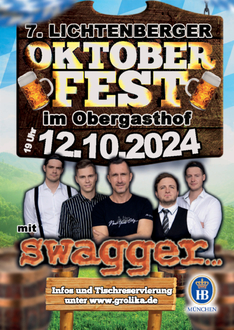 Am Sa.12. Oktober 2024 starten wir unser 7. Lichtenberger Oktoberfest im Obergasthof. Einlass ist ab 19:00 Uhr.