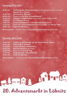 Dieses Jahr feiern wir das 20-jährige Jubiläum unseres Löbnitzer Adventsmarktes. Wir laden Sie voller weihnachtlicher Vorfreude ein, am 7. und 8. Dezember 2024 im Kirchgarten der evangelischen Kirche an diesem besonderen Ereignis teilzunehmen.
