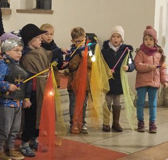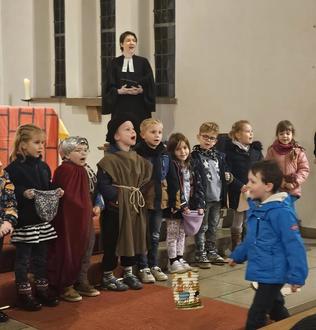 Am Martinstag versammelten sich viele Kinder mit ihren Eltern in der katholischen Kirche, um gemeinsam zu feiern. Die Wackelzahngruppe aus dem Diakonischen Kinderhaus spielte in diesem Jahr die Martinsgeschichte. Mit viel Freude und Mut zeigten die Kinder, wie der heilige Martin seinen Mantel mit dem frierenden Bettler teilte. Viele Zuschauer waren gekommen und schauten begeistert zu. Die Pfarrerin umrahmte das Martinsspiel mit einem schönen und locker gestalteten Gottesdienst. Gemeinsam sangen die Kinder und Eltern Laternen- und Martinslieder, die fröhlich durch die warme Kirche klangen. Frau Rofalski kümmerte sich, wie jedes Jahr, um eine angenehme Atmosphäre in der Kirche.