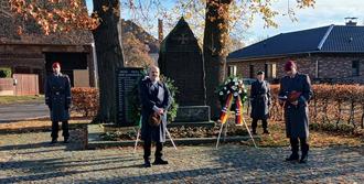 Nachdem Oberstleutnant Cremer ehrende Worte des Gedenkens sowie auch der Mahnung zum jetzigen Kriegsgeschehen äußerte, wurden Blumenkränze niedergelegt, um an alle Opfer sämtlicher Nationen zu erinnern.