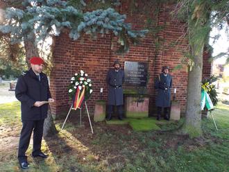 Nachdem Herr Major Köhler ehrende Worte des Gedenkens sowie auch der Mahnung zum jetzigen Kriegsgeschehen äußerte, wurden Blumenkränze niedergelegt, um an alle Opfer sämtlicher Nationen zu erinnern.