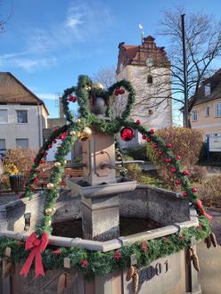 Er wurde mit Girlanden, Weihnachtskugeln, vielen Kerzen und mit viel Liebe und Geduld geschmückt. Am Tag glänzen die Kugeln im Sonnenlicht und abends verleihen die Kerzen dem Brunnen das weihnachtliche Flair.