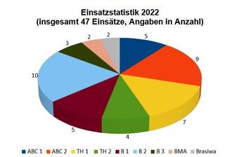 Werfen wir nun einen Blick auf die absolvierten Einsätze der Gemeindefeuerwehr im vergangenen Jahr. Hierbei beschränken wir uns auf einige Eckdaten zu den verschiedenen Stichworten, die sich in der Regel in den Kategorien ABC (atomar-biologisch-chemisch), Technische Hilfe (TH), Brandeinsatz (B), jeweils in den Stufen „klein“, „mittel“ und „groß“ sowie Brandmeldeanlagen (BMA) und Brandsicherheitswachen (Brasiwa) unterscheiden. Somit waren 2022 die Kameradinnen und Kameraden bei insgesamt 47 Einsätzen im Gemeindegebiet, aber auch überörtlich gefordert. Im Bereich ABC standen so fünf Einsätze in der Stufe „klein“ und neun Einsätze in der Stufe „mittel“ zu Buche. In der Stufe „klein“ waren hier zumeist Öl- bzw. Dieselspuren zu beseitigen. Die Einsätze der Stufe „mittel“ erfolgten ausschließlich als Alarmierungen als Komponente des ABC-Gefahrenabwehrzuges des Landkreises Nordsachsen und wurden überörtlich im Landkreis Nordsachen gefahren.