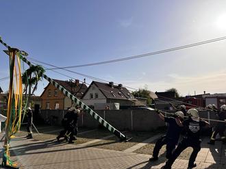 Der Bürgermeister Detlef Hoffmann begrüßte zum Fest. Mit einem „Zieh an!“ und vereinter Kraft der Kameradinnen und Kameraden unserer drei Ortsfeuerwehren stand in Sekundenschnelle und millimetergenau vorbereitet, der Löbnitzer Maibaum aufrecht und gerade.