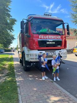 Wie in den letzten Jahren üblich, überraschten die Kameraden die Schulanfänger nach der Einschulungsfeier an der Grundschule Löbnitz und brachten sie sicher zu den jeweiligen Feiern mit ihren Familien.