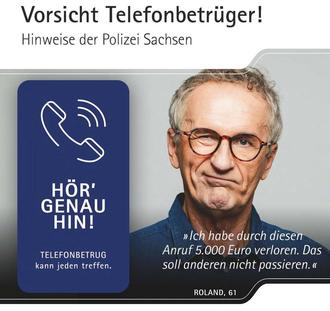 die Polizei Sachsen informierte uns über verschiedene Betrugsmaschen, mit der Bitte um Weiterleitung an Sie, Wir möchten Sie und Ihre Angehörigen und auch die junge Bevölkerung hiermit sensibilisieren, kritisch und vorsichtig zu sein. Betrüger geben sich am Telefon als Familienangehörige, Polizeibeamte, Staatsanwälte oder Bankmitarbeiter aus und täuschen eine dramatische Notsituation vor. Hinter diesen Anrufen verbergen sich hinterhältige Lügengeschichten, die die Täter überzeugend vortragen, um an Ihr Geld, Ihren Schmuck und andere Wertsachen zu gelangen. Geben Sie am Telefon keine Auskünfte über Ihre persönlichen und finanziellen Verhältnisse. Beenden Sie das Gespräch, wenn der Anrufer Geld fordert bzw. erbittet, egal welche dramatische Geschichte Ihnen erzählt wird. Übergeben Sie niemals Geld oder Wertsachen an Unbekannte, auch nicht an angebliche Polizeibeamte. Wenn Ihnen ein Anruf merkwürdig vorkommt, legen Sie einfach auf! Gesundes Misstrauen ist nicht unhöflich. Verständigen Sie im Verdachtsfall die Polizei unter der 110. Falls Sie auf einen Telefonbetrug hereingefallen sind, informieren Sie in jedem Fall die Polizei und erstatten Sie Anzeige.