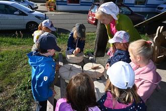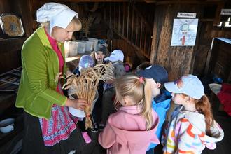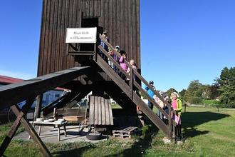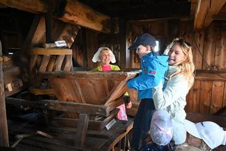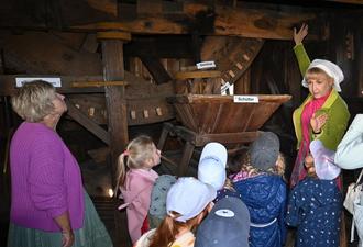 Danach konnte jeder mit der Müllerin die Handmahlsteine testen und selbst dabei mitmachen, erstes Mehl zu mahlen. Anschließend ging es endlich hinein in die alte Bockwindmühle. Dort konnten die Kinder verschiedene Getreide sehen, etwas über die großen Mahlsteine lernen und die schwere Krangreifzange bewegen. Sie wissen nun auch, dass das „Klipp-klapp“-Geräusch der Mühle durch das Rütteln entsteht, damit das Getreide nicht stecken bleibt. Sie erfuhren ebenso, warum das Mahlen von Mehl auch gefährlich sein konnte.