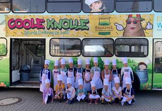 Die Kochbusaktion „Coole Knolle“ der Marktgemeinschaft „Erdäpfel – Kartoffeln aus Sachsen“ machte am Montag, 25.09.2023 halt in der Grundschule Liebschützberg. Gemeinsam mit dem Koch Michael Weise schälten, schnippelten und kochten die Kinder der Klassen 2 bis 4 im umgebauten Doppeldeckerbus gesunde Gerichte aus der Kartoffel. Unter fachkundiger Anleitung des Chefkochs bereiteten die Schülerinnen und Schüler selber Kartoffelsuppe, handgeschnitzte Pommes und Kartoffeln mit Quark aus sächsischen „Erdäpfeln“ zu. Am Ende der Kochaktion ließen es sich alle schmecken. Der eine oder andere probierte die Rezepte auch gleich zuhause aus. Dafür erhielten alle Schüler einen Beutel mit Kartoffeln, eine Schürze, eine Kochmütze und viele schöne Geschenke. Von den Kindern und den Lehrern gibt es ein dickes Dankeschön für einen rundherum gelungenen Tag.
