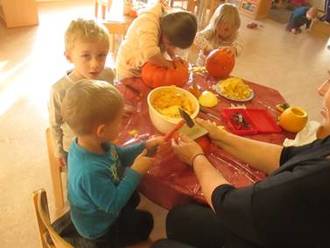 Vom 20.10.2025 bis 24.10.2025 fand im Kinderhaus Schönnewitz das Projekt „Rund um den Kürbis“ statt. Alle Gruppen entdecken eine Woche lang alles rund um den Kürbis. So wurden bei den kleinsten aus Naturmaterialien kleine Kürbisgestecke gebastelt, Kürbisse mit allen Sinnen erkundet, ausgehöhlt und ein wunderschönes Wichtelhaus geschnitzt. Im Kindergarten wurde erkundet was ein Kürbis kann und wie nützlich er ist. Außerdem wurden Kürbislaternen gebastelt, Kürbismuffins gebacken, Gestecke gebastelt und jede Menge geschnitzt. Am Freitag fand die Woche ihren Abschluss mit einem gemeinsamen, gesunden Frühstück, Kürbis-Schnitz-Wettbewerb und dem Kochen einer köstlichen Kürbissuppe. Alle Kinder waren stolz auf ihre entstanden Kunstwerke, haben sich im backen und kochen ausprobiert und jede Menge gelernt. Wir möchten uns herzlich bei allen Eltern für die Spende der Kürbisse bedanken. Nach dieser aufregenden Woche beginnen nun unsere Vorbereitungen für unser Laternenfest am 14.11.2025.