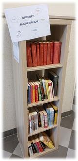 Ab sofort, gibt es in der Gemeindeverwaltung ein offenes Bücherregal. Wer mag, nimmt sich Bücher heraus, wer mag, stellt welche hinein. Es ist Kostenlos, unverbindlich und anonym sowie frei von jeglichen Formalitäten. Es gibt keine Mitgliedschaft, keine Beiträge, keine Leihfristen und ist für jedermann zugänglich.