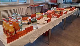 Für den letzten Schultag vor den Weihnachtsferien hatten sich die Klassen mit ihren Klassenlehren Gedanken gemacht, wie sie die bevorstehende Weihnachtszeit einläuten könnten. Und es sind ganz tolle Ideen dabei entstanden. English breakfast, Basteln, Volleyballturnier, Kinovorführungen und Märchenstunde waren nur einige davon. Die Klasse 9 b hat an diesem Tag den kulinarischen Part übernommen und hatte Kuchen, Waffeln, Würstchen, heiße Getränke und vieles mehr im Angebot. Mit dem Erlös aus den Verkauf haben sich die Mädchen und Jungen ihre Klassenkasse aufgebessert.