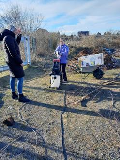 +++ Fleißig, fleißig kann man da nur sagen! Die Mädchen vom GTA Haus, Hof und Garten unter Leitung von Frau Westmeier greifen unserem Hausmeister aktiv mit unter die Arme. Selbst jetzt in der kalten Jahreszeit gibt es genug Arbeiten im Gelände. Nachdem Herr Däbritz fleißig Sträucher in Form gebracht hat, häckseln die Mädchen das angefallene Schnittgut und greifen dabei auch mal beherzt zur Baumschere. Und da wir nichts wegschmeissen, kommen die Holzstücke gleich als Mulchschicht um die Pflanzen an unserer Pyramide. Für soviel Engagement gibt es hier an dieser Stelle auch mal ein großes