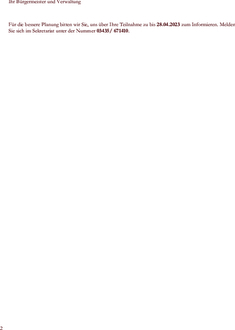 Für die bessere Planung bitten wir Sie, uns über Ihre Teilnahme bis 28.04.2023 zu informieren. Melden Sie sich im Sekretariat unter der Nummer 03435 671410.
