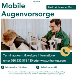 Mirantus ist ein Gesundheitsunternehmen aus Berlin, das gemeinsam mit lokalen Partnern und Gemeinden die augengesundheitliche Versorgung in ländlichen Regionen verbessert. Der Fokus der Untersuchung liegt in der Früherkennung von Veränderungen des Sehens bzw. des vorderen und hinteren Augenabschnitts. Der schriftliche Ergebnisbericht erhält keine Diagnose und ersetzt nicht die Diagnosestellung und Behandlung durch einen Augenarzt.