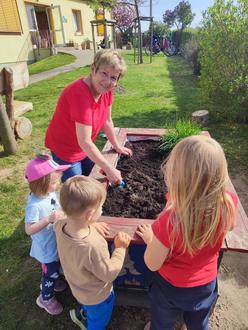 Fleißige Mamas verschnitten Hecken und Sträucher, Kreidetafeln laden die Kleinen nun zum Malen ein. Bunte Blumen und Sträucher wurden mit den Kindern gepflanzt und verschönern nun unseren Eingangsbereich.