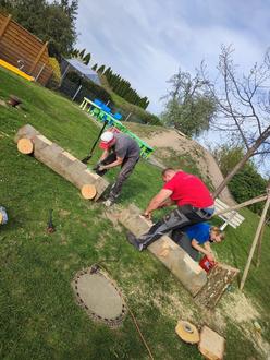 Der Spielzeugschuppen wurde mit bunten Farben freundlicher angestrichen, aus großen Baumstämmen bauten Papas Eisenbahnen und eine Motorikwand für die Kleinsten entstand.