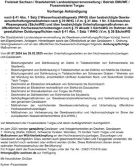 Der Staatsbetrieb Landestalsperrenverwaltung als Gewässerunterhaltungspflichtiger kündigt hiermit