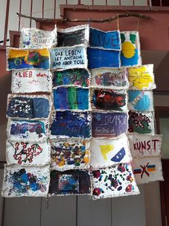 +++ „Kunst ist Freiheit!“. Unter diesem Motto haben die Schüler des GTAs Kunst mit Frau Steinbock mehrere Wochen gearbeitet. Nun ist ihr Gesamtwerk fertig und in der Aula unserer Schule ausgestellt. Ziel der Arbeit war es, die Phantasie der Mädchen und Jungen anzuregen und ihr freien Lauf zu lassen. Es gab keine Zwänge und Richtlinien, Perfektion spielte dabei auch keine Rolle - einfach mal den Kopf abschalten und den Gefühlen vertrauen! Als Materialien standen Leinwände, Farben, Wolle, Pappe und Sprühfarbe zur Verfügung. Zur Aufhängung diente ein Stock aus dem Park – Recycling! +++