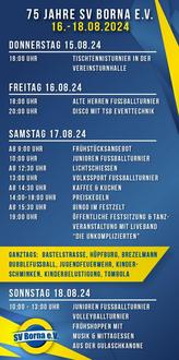 An drei tollen Tagen feiern wir vom 16. bis 18. August auf dem Sportplatzgelände in Borna das 75-jährige Bestehen unseres Vereins.