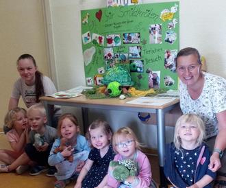 Die kleinen Forscher erkundeten diese spannenden Tiere auf vielfältige Art und Weise. Dabei waren unsere Künstler so aktiv, dass eine große Galerie an tollen Bilder entstand. Das Highlight, stellte der Besuch von griechischen Landschildkröten, welche die Kinder bestaunten und streicheln durften, dar. An dieser Stelle, möchten wir uns nocheinmal bei Herrn Blume und seiner Frau bedanken. Dieses Erlebnis werden wir lange in Erinnerung behalten.