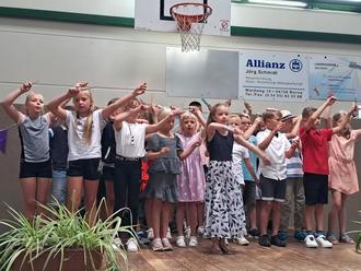 Die Klassen 3a und 3b hatten dafür ein tolles Programm vorbereitet. Mit mitreißenden Liedern, Gedichten, lustigen Sketchen und einer Sporteinlage sorgten sie beim Publikum für gute Laune.