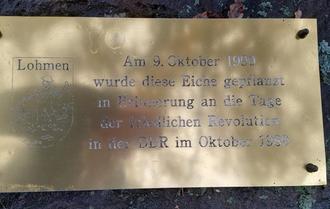 | Um an diese Tage im Oktober, die weniger spektakulär in der Erinnerung bleiben als die Maueröffnung im November, zu erinnern, pflanzten die unten genannten Organisatoren -gemeinsam mit Lohmener Einwohnern- am 9. Oktober 1990 die etwa 10 Jahre alte Herbsteiche im Schulbereich der Stolpener Straße: | |