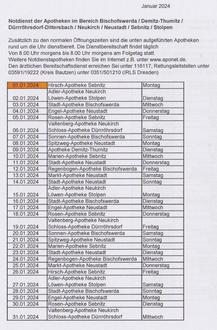 | Neue Apotheke Bischofswerda | Bautzener Str. 19 | 03594 713090 | 01877 | Bischofswerda |
