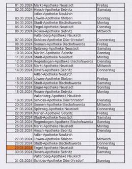 Zusätzlich zu den normalen Öffnungszeiten sind die unten aufgeführten Apotheken rund um die Uhr dienstbereit. Die Dienstbereitschaft findet täglich von 8.00 Uhr morgens bis 8.00 Uhr morgens am Folgetag statt. Weitere Notdienstapotheken finden Sie im Internet z.B. unter www.aponet.de.