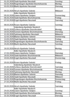 Zusätzlich zu den normalen Öffnungszeiten sind die unten aufgeführten Apotheken rund um die Uhr dienstbereit. Die Dienstbereitschaft findet täglich on 8.00 Uhr morgens bis 8.00 Uhr morgens am Folgetag statt.
