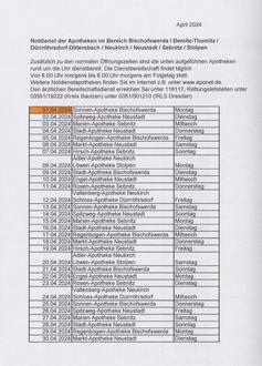 Notdienst der Apotheken im Bereich Bischofswerda/ Demitz-Thumitz/ Dürrröhrsdorf-Dittersbach /Neukirch/Neustadt/ Sebnitz/Stolpen