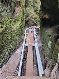 Sie müssen alles Neue von oben bis zur Baustelle tragen und alles, was wegmuss, von der Baustelle bis nach Rathen. Ich kann Ihnen bestätigen, dass dies durchweg schwere Gegenstände sind, egal ob Eisenträger oder Auflagen.