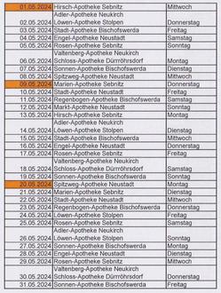 Zusätzlich zu den normalen Öffnungszeiten sind die unten aufgeführten Apotheken rund um die Uhr dienstbereit. Die Dienstbereitschaft findet täglich von 8.00 Uhr morgens bis 8.00 Uhr morgens am Folgetag statt. Weitere Notdienstapotheken finden Sie im Internet z.B. unter www.aponet.de.
