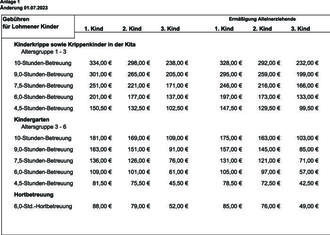 Die aufgeführten Beiträge sind jeweils für das erste Kind und die volle Betreuungsdauer. Für Geschwister und einen verkürzten Aufenthalt sind niedrigere Beiträge zu zahlen (siehe Anlage). Diese Gebührenerhöhung wird ab 01.07.2023 zum Tragen kommen.