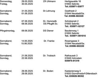 Bereitschaftsdienst I. Halbjahr 2025 der Zahnärzte für den Notdienstbereich Sebnitz und Neustadt/Sa.