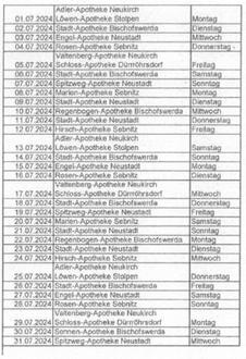 Zusätzlich zu den normalen Öffnungszeiten sind die unten aufgeführten Apotheken rund um die Uhr dienstbereit. Die Dienstbereitschaft findet täglich von 8.00 Uhr morgens bis 8.00 Uhr morgens am Folgetag statt. Weitere Notdienstapotheken finden Sie im Internet z.B. unter www.aponet.de.