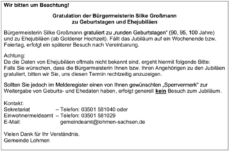 Bürgermeisterin Silke Großmann gratuliert zu „runden Geburtstagen“ (90, 95, 100 Jahre) und zu Ehejubiläen (ab Goldener Hochzeit). Fällt das Jubiläum auf ein Wochenende bzw. Feiertag, erfolgt ein späterer Besuch nach Vereinbarung.