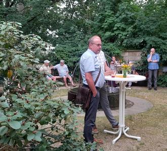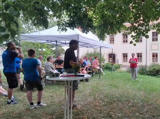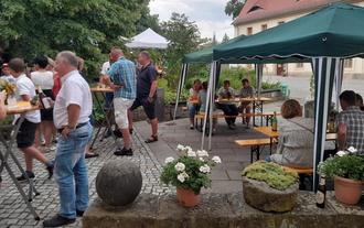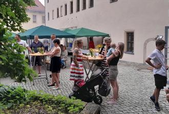In lockerer und ungezwungener Atmosphäre konnte sich jeder etwas Gegrilltes oder Getränke holen. Es ergaben sich gute Gespräche mit den unterschiedlichsten Gästen um den Brunnen herum, auf der Wiese oder im Schloßhof.