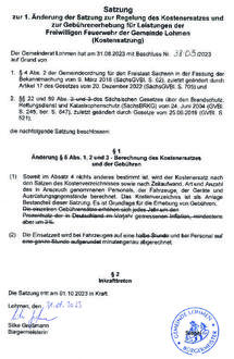38-03/2023 Satzung zur 1. Änderung der Satzung zur Regelung des Kostenersatzes und zur Gebührenerhebung für Leistungen der Freiwilligen Feuerwehr der Gemeinde Lohmen (Kostensatzung)
