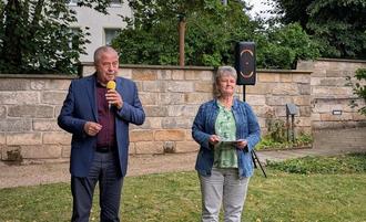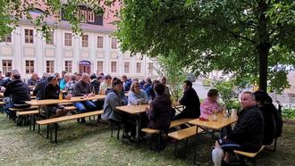Zum Sommerempfang der Gemeinde Lohmen hatte Bürgermeisterin Silke Großmann am Freitag, den 22.08.2025 eingeladen. Petrus war uns wohl gesonnen und wir durften mit ca. 55 Gästen im Freien feiern. Der Schloßhof der Gemeinde Lohmen bot hierfür wieder ein herrliches Ambiente. Sei es am Brunnen oder unter den geschützten und schattenspendenden Bäumen.