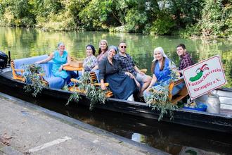Darum entschlossen sich die Vereinsmitglieder, auf dem Kahn einen Gurkenflieger mit Feldarbeitern zu präsentieren. Das Gestell ragte über den Kahn hinaus, sodass es den beiden fleißigen Arbeitern, die auf dem Gurkenflieger lagen ein Leichtes war, während des Kahnkorsos die „Gurken zu pflücken“.