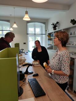 Nach dreiwöchiger Schließzeit öffnete die Stadtbibliothek Lübben am Dienstag, den 8. August 2023 wieder für ihre Leserschaft. Dabei überraschte sie durch einen neu gestalteten Eingangsbereich. Blickfang ist der moderne, in Grün und Grau gestaltete, Ausleihtresen, der zwei Arbeitsplätze aufweist, abschließbare Fächer und eine illuminierte Auslage für neu erworbene Literatur.