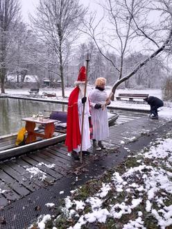 In diesem Jahr war es anders. Der Nikolaus machte sich mit seiner Gehilfin mit dem Kahn auf den Weg nach Boblitz. Am Samstag, den 10. Dezember gegen 16.00 Uhr war es soweit, als er bei leichtem Schneefall im Boblitzer Naturhafen einfuhr. Bei den Kindern herrschte große Freude und die Augen strahlten. Dann verteilte der Nikolaus seine Geschenke. Er wusste genau, ob die Kinder artig waren, Blödsinn gemacht hatten und ob sie saubere Schuhe am Nikolausvorabend vor die Tür gestellt hatten. Zu einem Kind sagte er: „Deine Schuhe waren aber nicht so sauber“, worauf schlagfertig geantwortet wurde: „Ich hatte keinen Lappen“. Mit Kuchen, Kinderpunsch und Stockbrot ging es dann weiter. Die Stimmung war