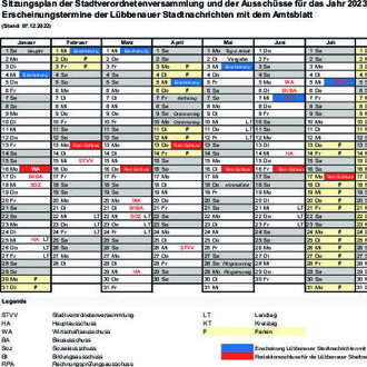 In der Stadtverordnetenversammlung am 7. Dezember 2022 wurden die Sitzungstermine für die Stadtverordnetenversammlung und den Hauptausschuss sowie die einzelnen Fachausschüsse für das Jahr 2023 bestätigt. In den Übersichtskalender eingearbeitet sind wie gewohnt die Redaktionsschlüsse und Erscheinungsdaten für die Lübbenauer Stadtnachrichten mit dem Amtsblatt für die Stadt Lübbenau/Spreewald und dem Kulturlotsen. Allerdings ist gegenwärtig der Kulturlotse mit den Veranstaltungshinweisen für die Region durch die Einschränkungen im Zusammenhang mit der Corona-Pandemie noch bis mindestens März ausgesetzt. Die Stadt hält dennoch an der Fortführung dieser Kommunenübergreifenden Ausgabe weiterfest.