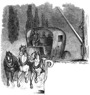 Dies Gefühl der Wonne dauert indessen nur so lange, als man in der Zukunft oder Vergangenheit lebt. Die Gegenwart ist schrecklich, und sie wurde es, als wir an einem warmen Augustabend in dem dumpf dröhnenden Kasten aus dem Post-Thorwege der Spandauer Straße hinausfuhren. Die Straßen waren fast fremd, die Menschen andere, als wir die Bilder, Stück für Stück, durch die kleinen Fensteröffnungen der Kutsche vorübergleiten sahen. Ein schleierartiger heißer Dunst lag zwischen den Gegenständen und drang in unser Gefängniß, das außer uns noch eine kränkliche Frau mit einem Bündel Kinderzeug, in das ein junger Weltbürger zweifelhaften Geschlechts gewickelt war, und ein diesem zarten Alter schon seit geraumer Zeit entwachsenes Mädchen enthielt. Ein wenig frischere Luft umwehete uns, als wir auf die trostlose Chaussee kamen, die sich durch die Einöden von Tempelhof und Mariendorf hindurchquält, dagegen stellte sich ein neues Leiden in der nächsten Ortschaft ein. Es war, da wir in eine Beichaise (Zusatzkutsche, wenn das Platzangebot der Hauptkutsche nicht ausreichte) gekommen waren, das Wagenwechseln, bei dem wir bis Lübben allen möglichen Turnübungen unterworfen waren und hinsichtlich unserer werthen Persönlichkeiten fast zu schlecht wegkamen, als in Baruth der Postmeister dem Postillon zurief: „Laden Sie aus, ich habe den Sechssitzigen bestellt.“ Das „Ausladen“ betraf uns.