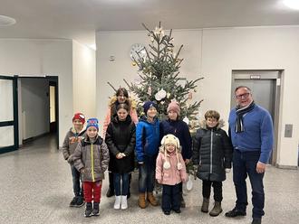 Kinder der Sozialpädagogischen Familienhilfe beim Baumschmücken im Rathaus