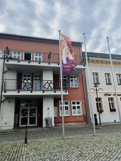 Flagge "NEIN! Zu Gewalt gegen Frauen" vor dem Rathaus der Stadt Lübbenau/Spreewald
