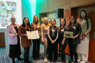 DESWOS-Vorständin Maren Kern mit Azubis und Mitarbeiter der WIS anlässlich der Auszeichnung in Berlin
