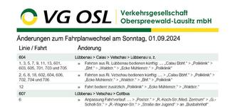Mit dem neuen Fahrplan der Verkehrsgesellschaft Oberspreewald-Lausitz mbH (VG OSL) gibt es Anpassungen auf verschiedenen Strecken. Alle Fahrplan- und Haltestellenänderungen können Sie auf der Homepage der VG OSL unter www.vgosl.de/Aktuelles einsehen.